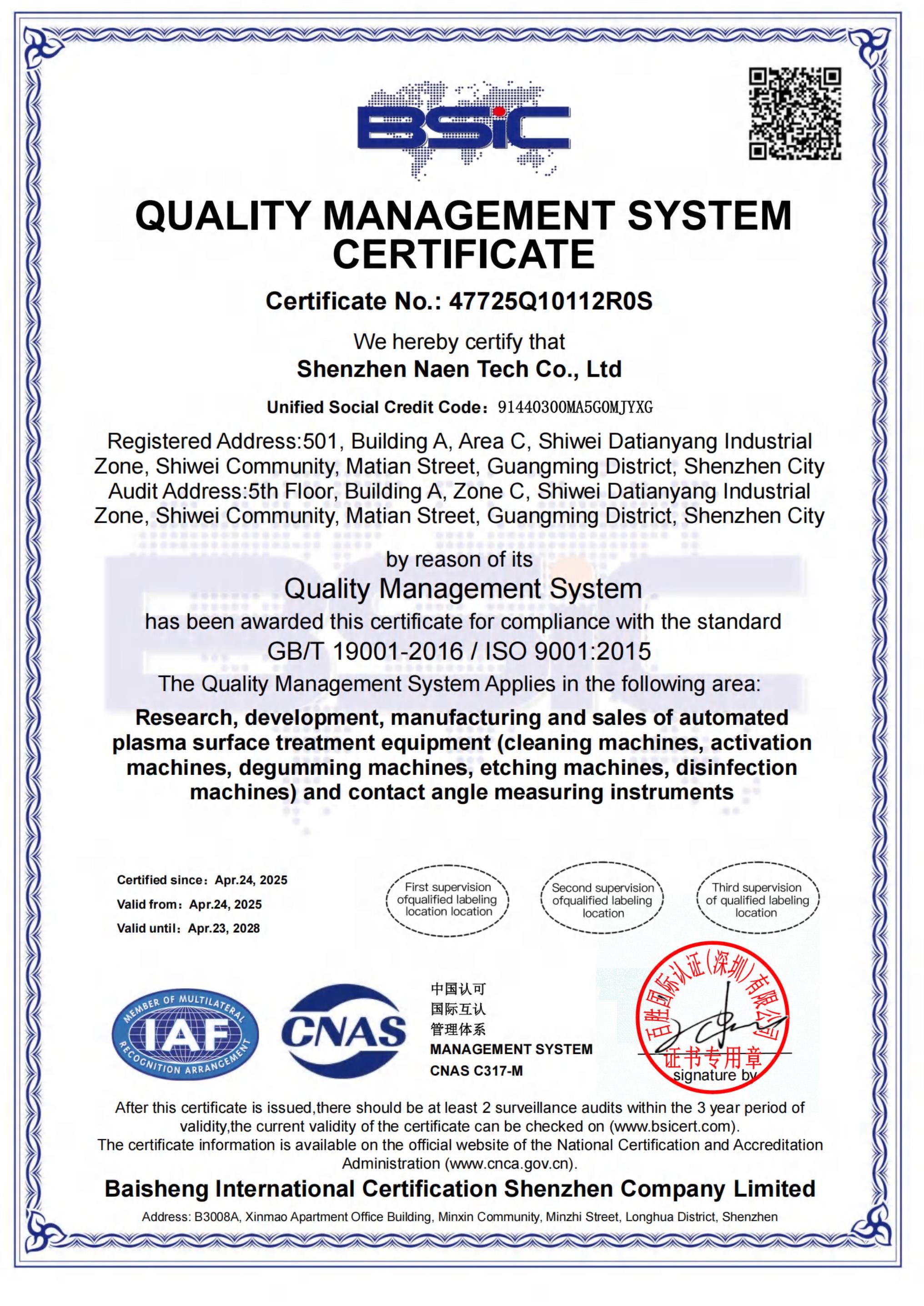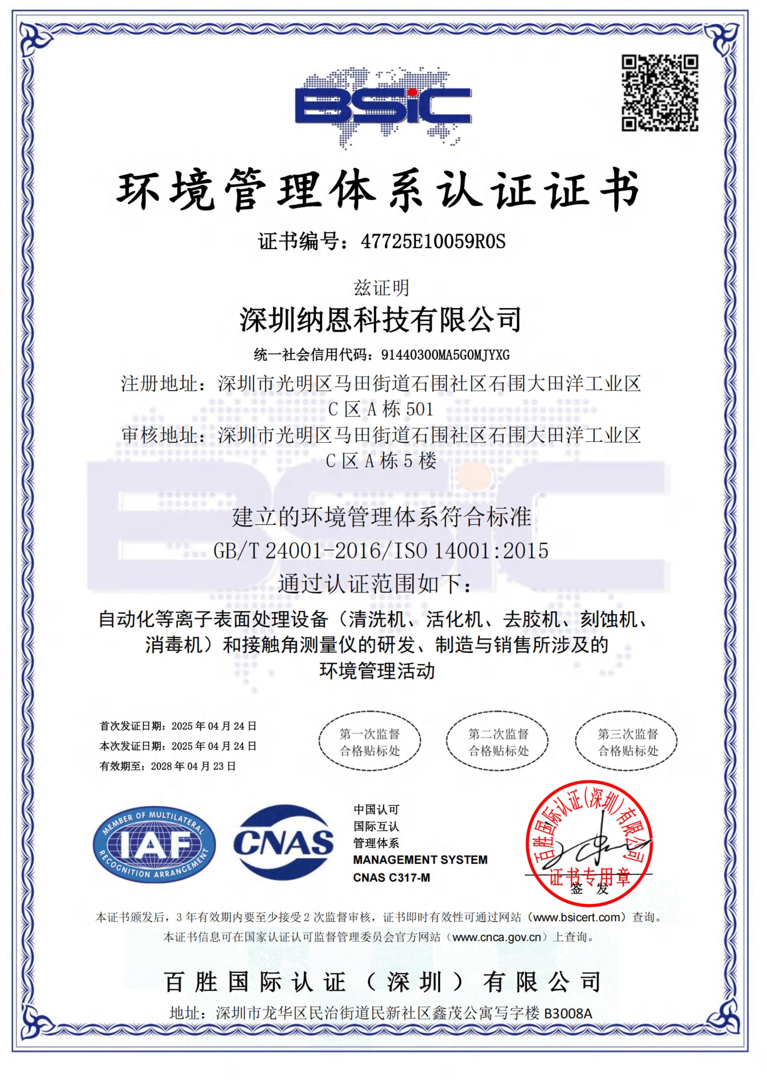 深圳納恩科技有限公司始創(chuàng)于2010年,總部位于深圳市,在香港設(shè)有研發(fā)分公司,是一家專注于低溫等離子體(plasma)技術(shù)應(yīng)用和高端智能裝備研發(fā),制造和銷售的高科技公司。目前主要產(chǎn)品包括大氣及真空等離子清洗機(jī)、等離子去膠機(jī)、等離子刻蝕機(jī)、等離子表面處理設(shè)備、電暈機(jī)、低溫介質(zhì)阻擋放電裝置(DBD)等。